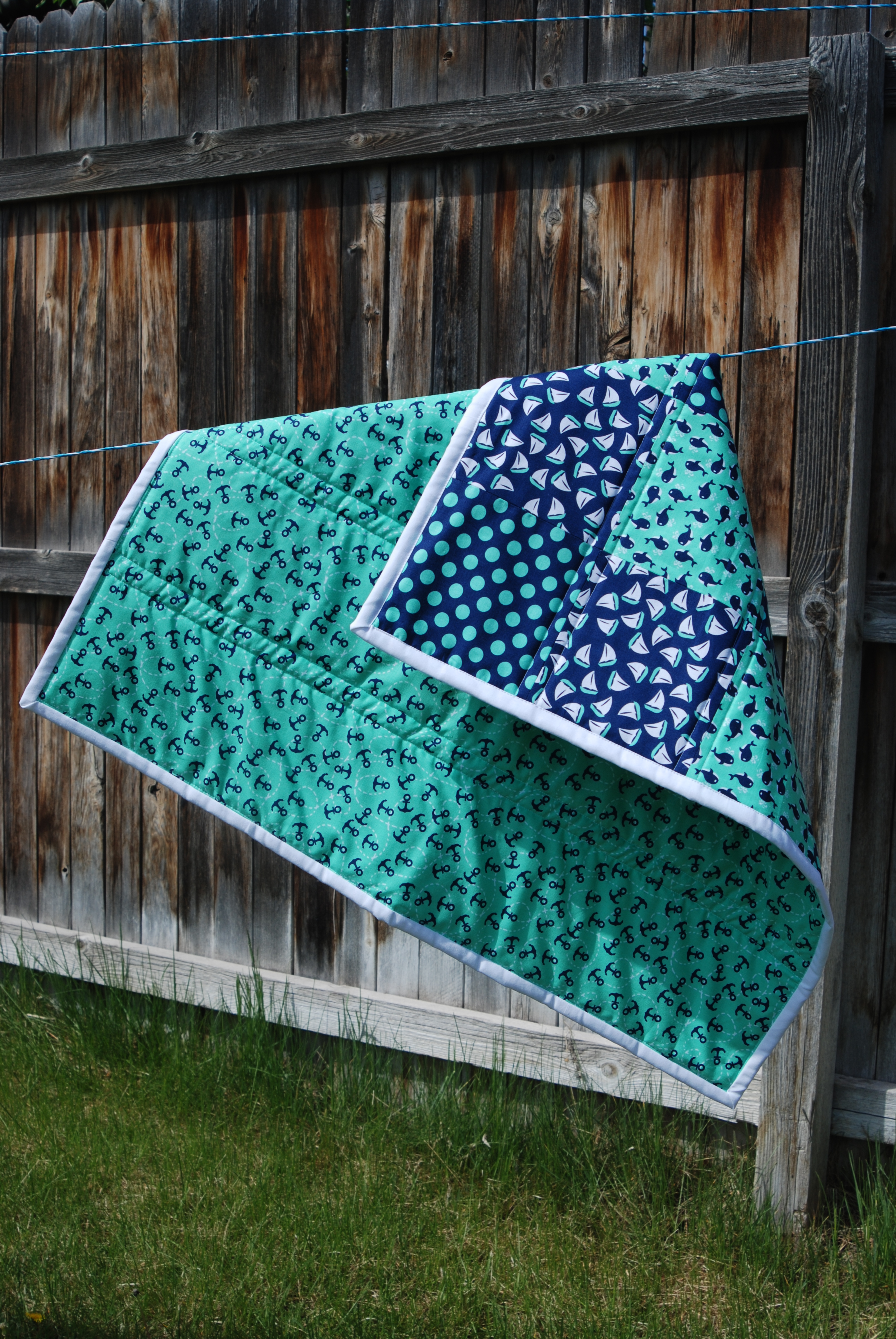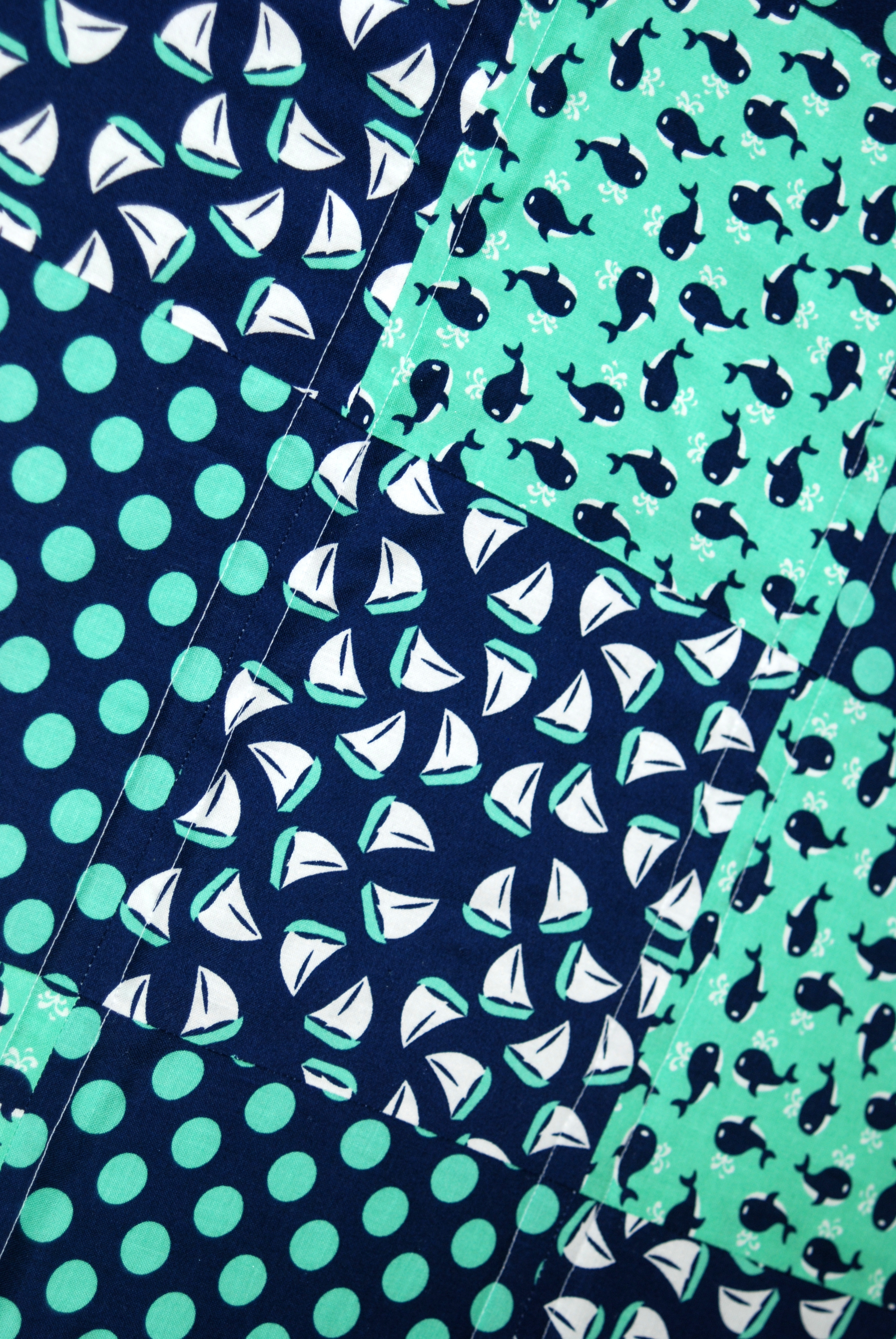The fabric is from The Littles Collection by Michael Miller. For the front I cut 6″ squares of the dots, sailboats, and whales prints and pieced them together. It is backed with the adorable anchors print, and I quilted it on either side of the seams vertically. Of course if you turn it (there is really no right way for this quilt, it is a square after all) then I did it horizontally. I had a hard time deciding if I should bind it in navy or white, but ended up choosing white as I thought it would stand out a bit more.
