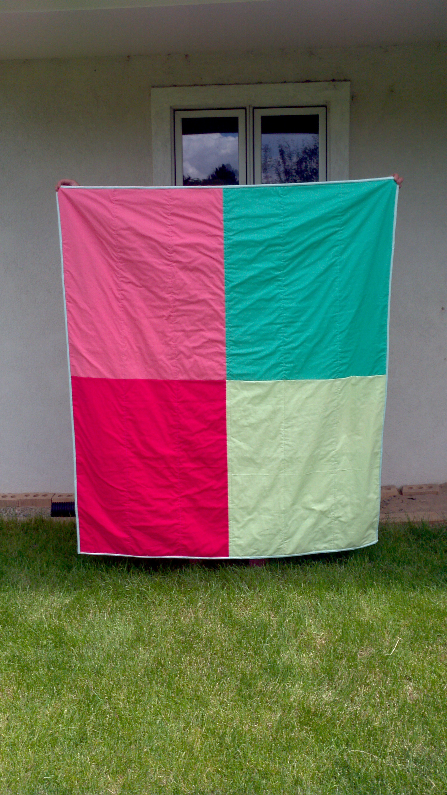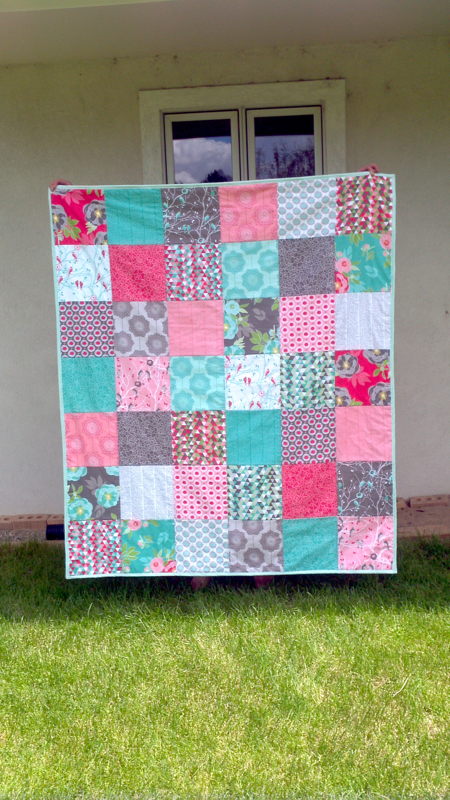 Since Allison had turned 2, I decided she also needed a blanket of a similar size. I had some lovely Summer Song by Riley Blake that I had been hoarding for a while for this exact purpose, so I was very happy to make a simple but fun quilt for Allison’s “toddler quilt”. I apparently didn’t take any actual photos of it on my camera because it was going to live at my house (and I get to see it all the time) but I did manage one terrible one on my phone (that I posted to instagram then promptly deleted).