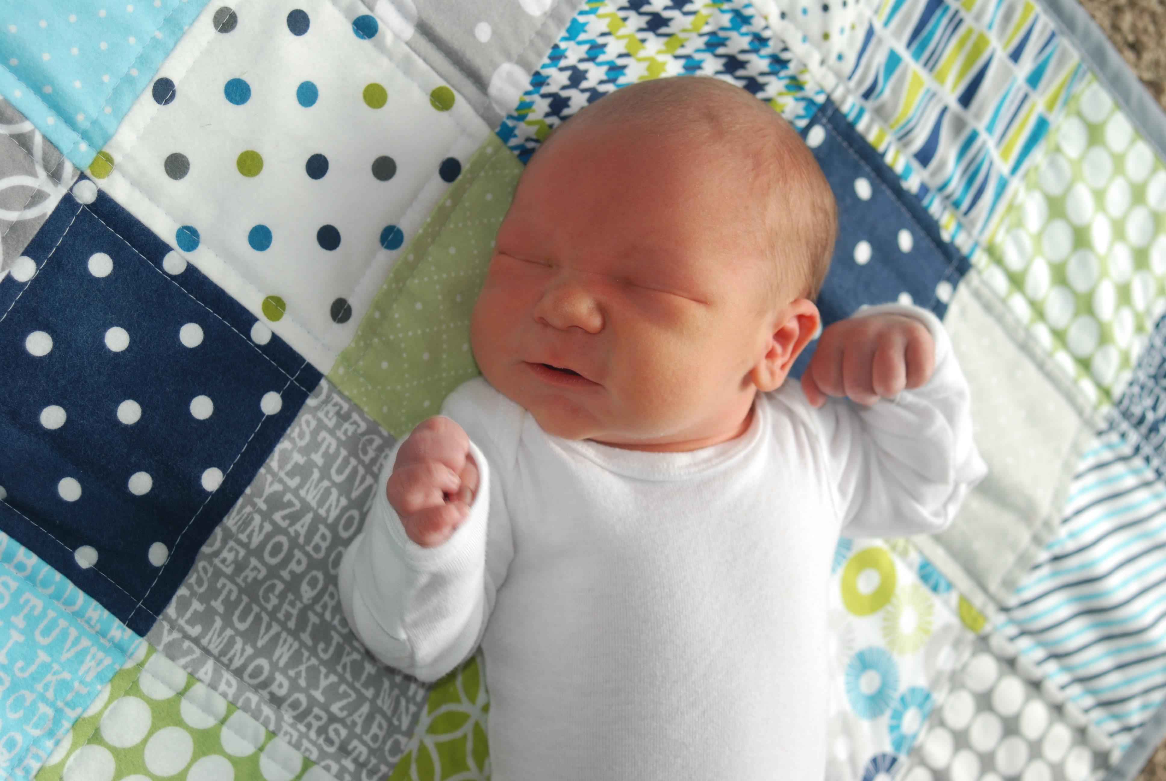 I quilted vertically and horizontally on both sides of the squares making a cool grid pattern on the back. Here is baby Mikey enjoying his quilt at just a few days old.