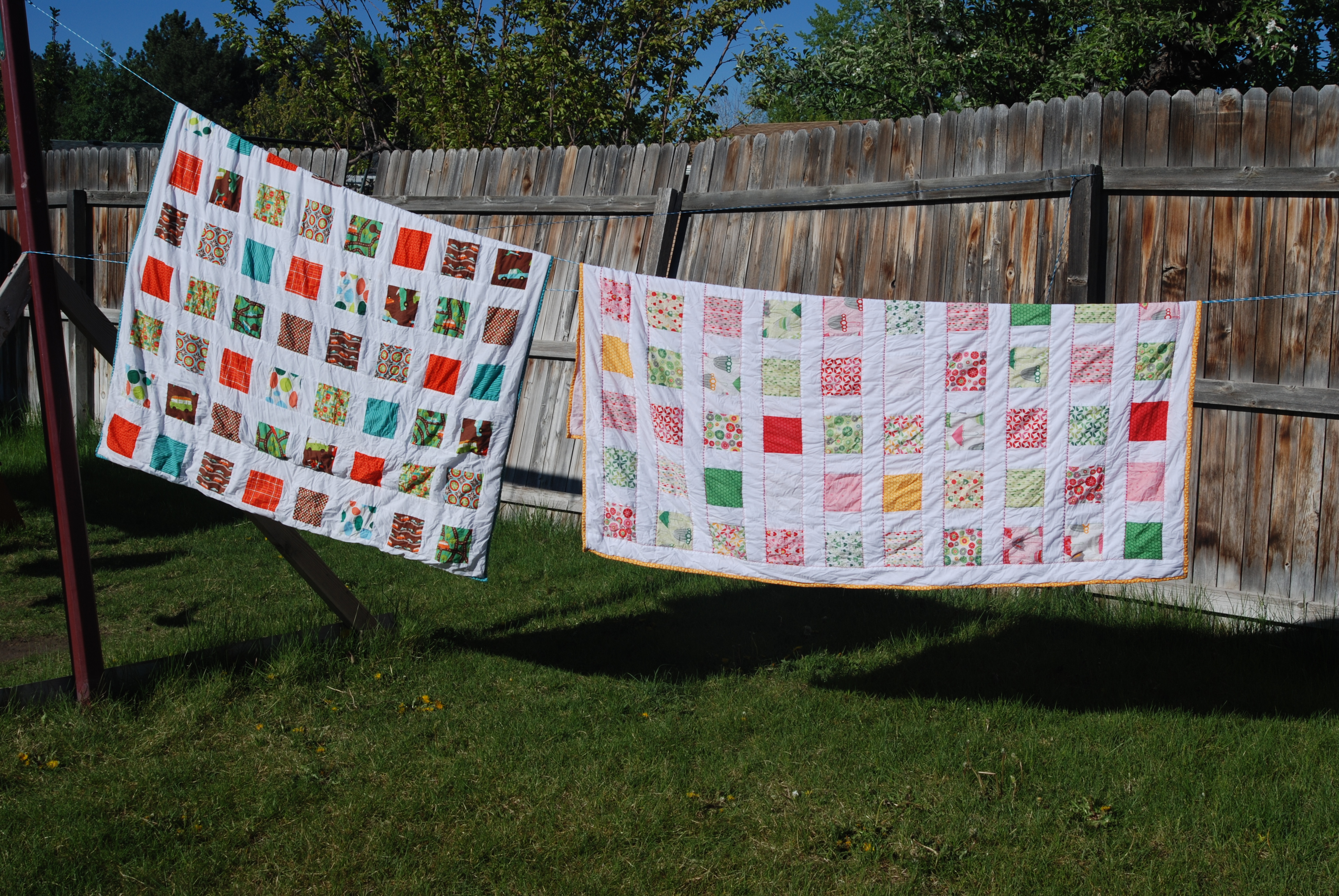 My two oldest kids have quilts that are just smaller than twin size that I made for them a few years ago. I made them that size because they were smaller then (2 and 3) and I wanted them to have something that would last a while, but that they could still drag around. Here is a picture of them hanging out all wrinkly style on the line last summer.