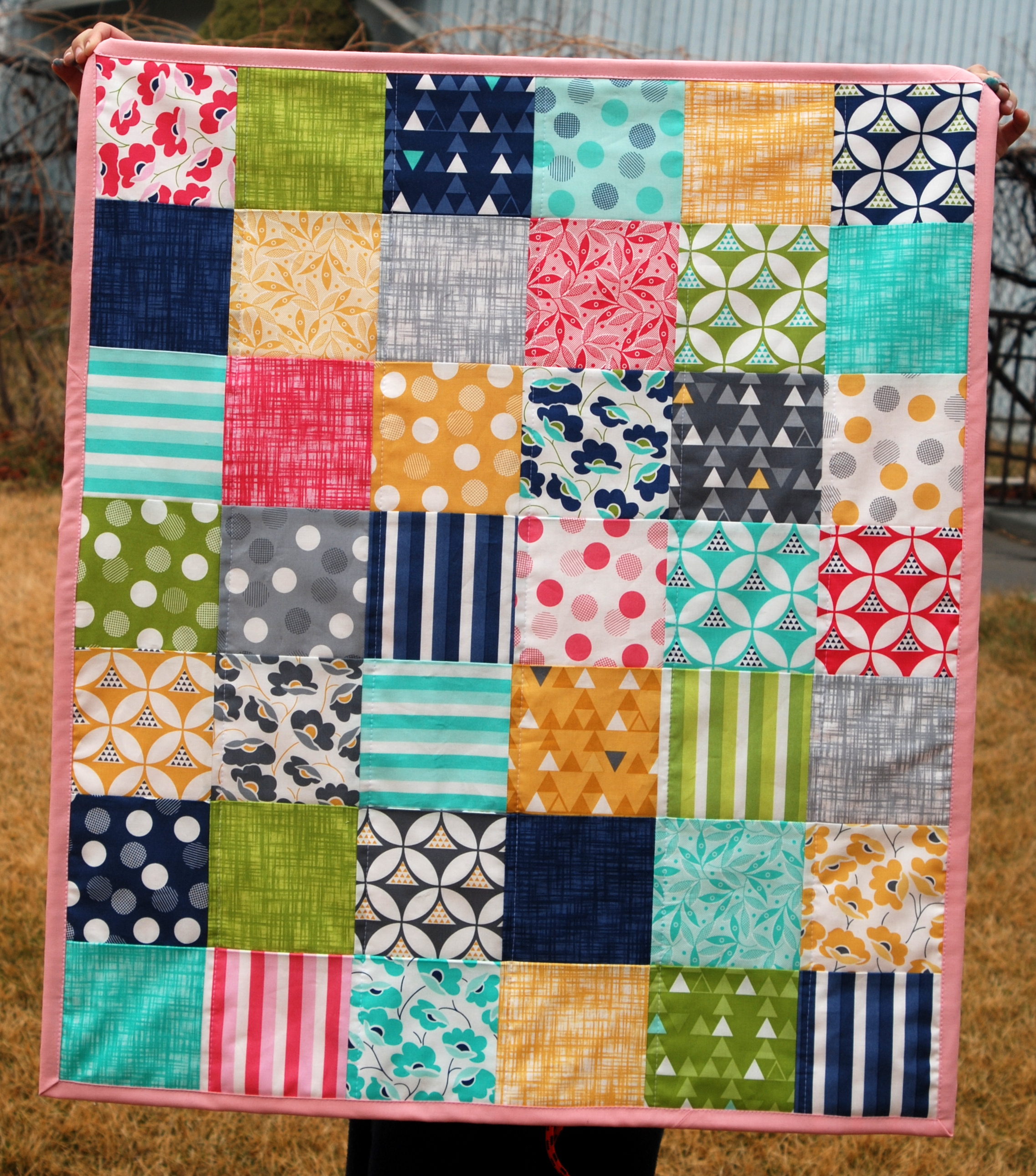 This quilt is made from Mixed Bag by Studio M for Moda. This is probably the most popular quilt I have made, as I have made and sold several! It is such a fun mix of prints and perfect for baby boys! This one was backed with some awesome blue chevron (from Joann’s) and bound in a red Kona Solid. I quilted it vertically on one side of the squares.