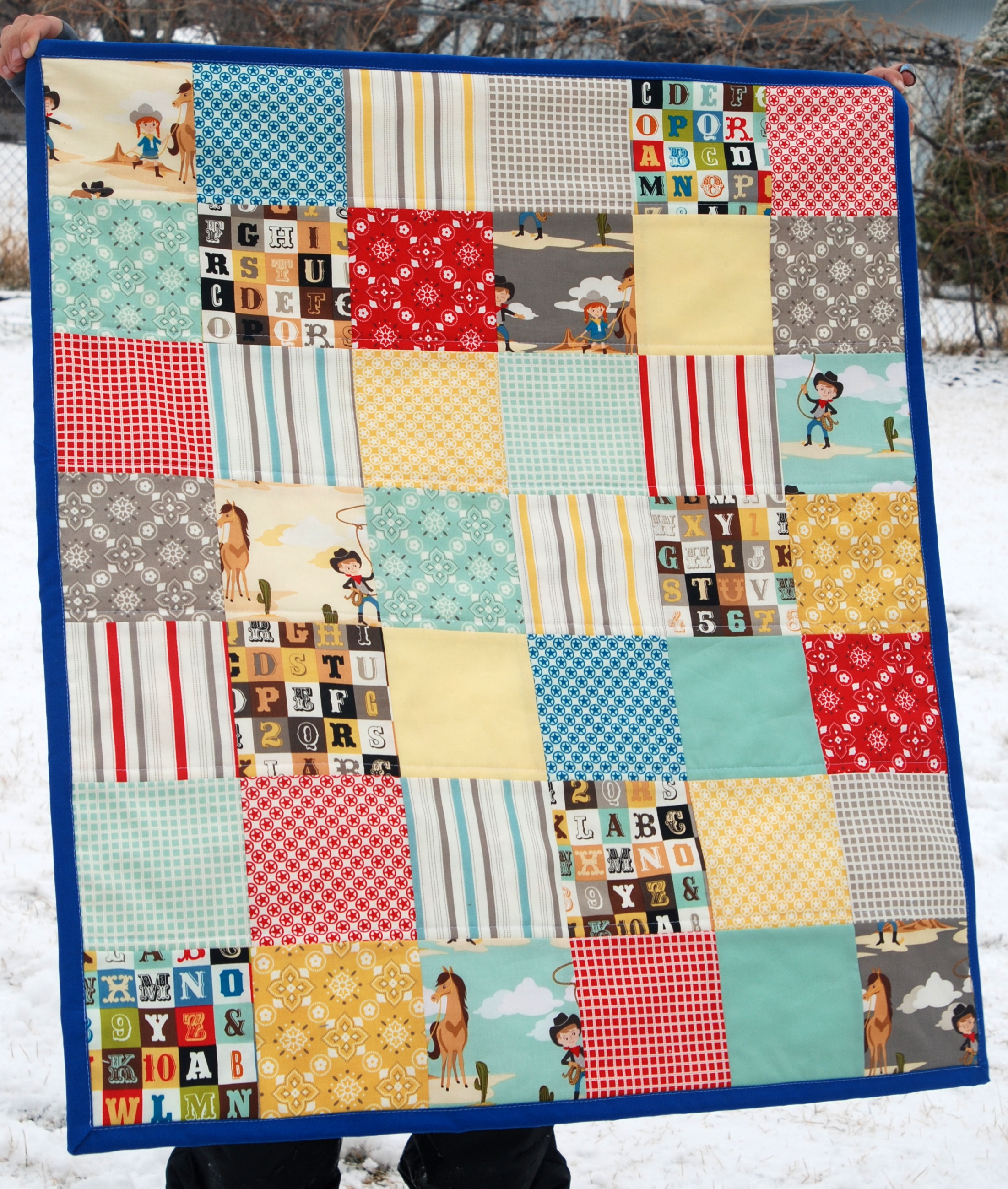 This line is Sasparilla by Riley Blake. It is ridiculously adorable, and is perfect for a boy or a girl. I backed it in the blue cowboy and cowgirl print from the same line, and bound it in a beautiful blue Kona Solid. I quilted this one horizontally because I didn’t want to interfere too much with the fun backing.